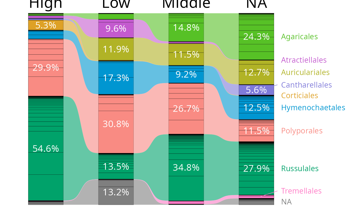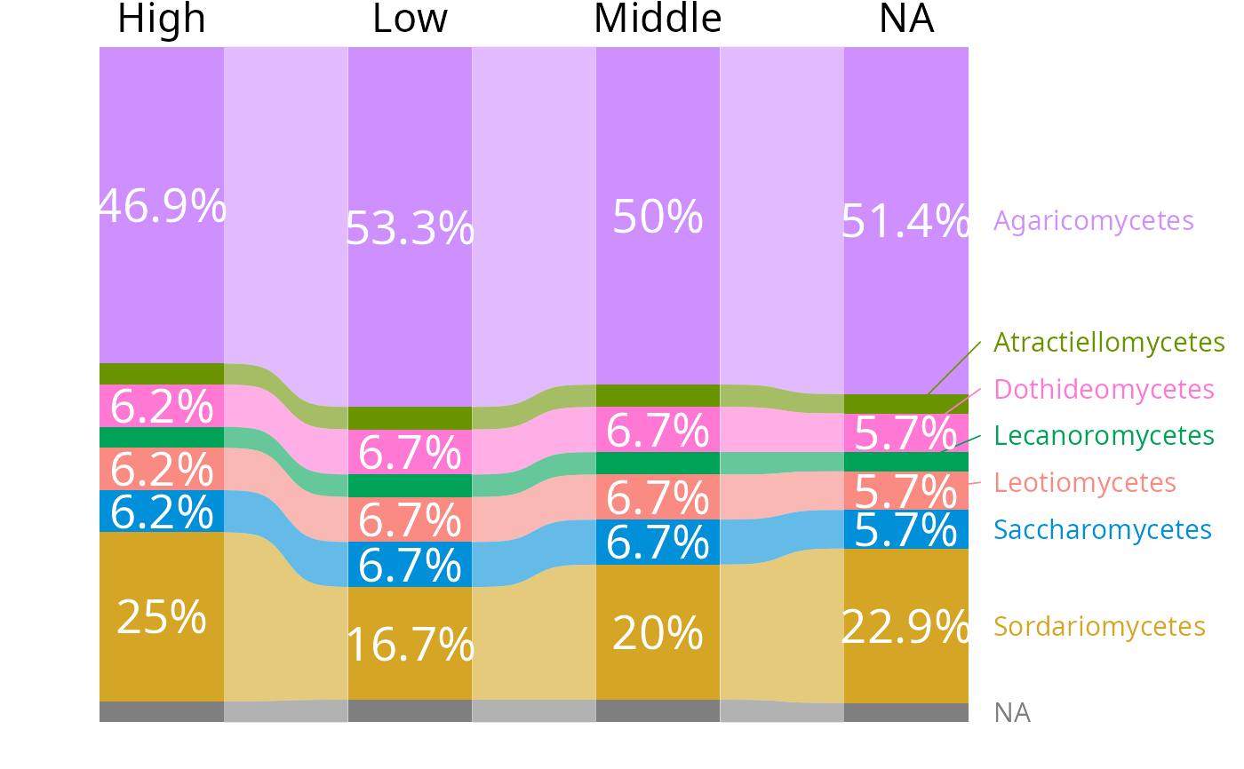 factis not "Sample", add curved ribbons connecting matching taxa between adjacent bars. Only meaningful whenfacthas more than one level.- ribbon_alpha