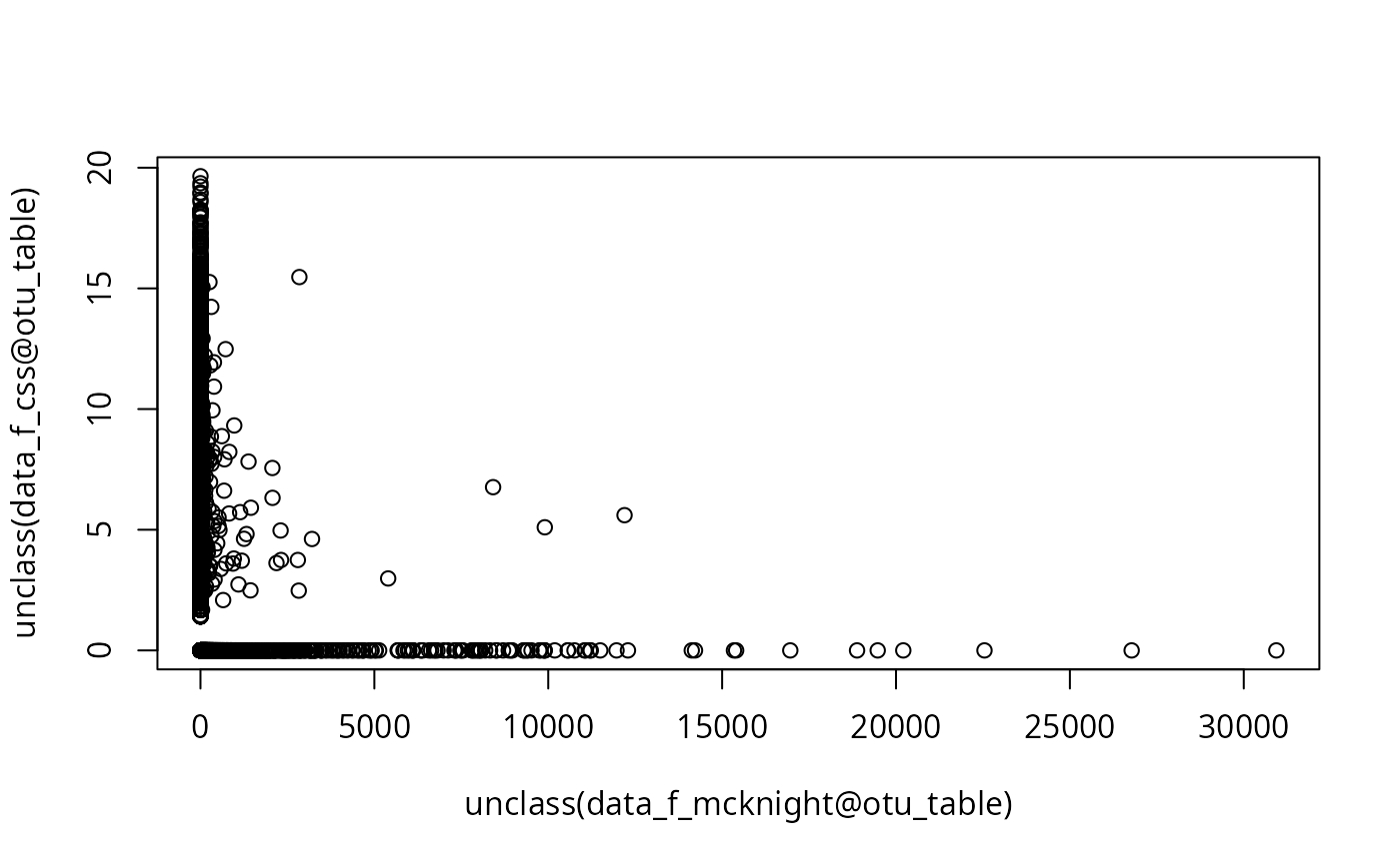 plot(unclass(data_f_mcknight@otu_table), unclass(data_f_css@otu_table))