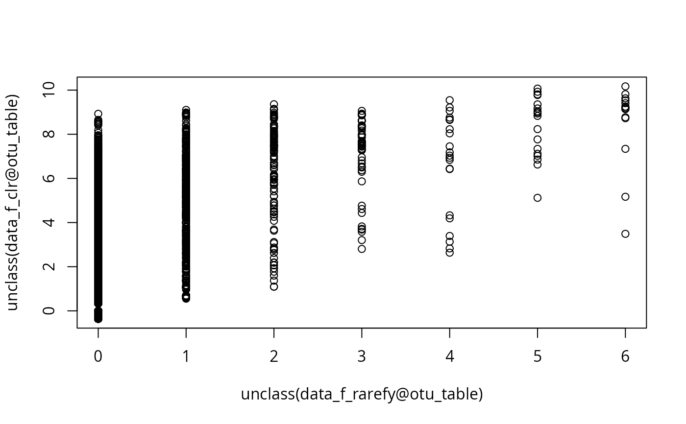 plot(unclass(data_f_rarefy@otu_table), unclass(data_f_clr@otu_table))