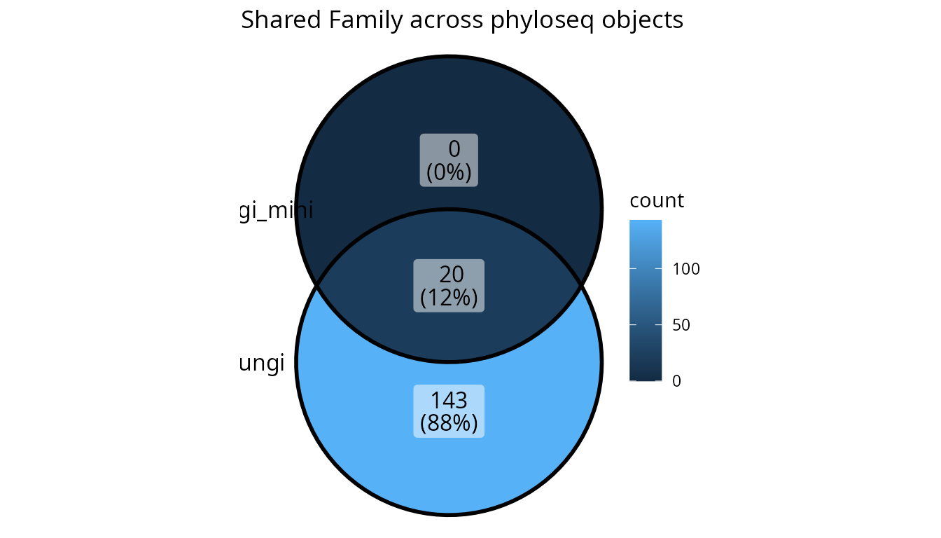 diagrams showing shared taxonomic values across phyloseq objects: