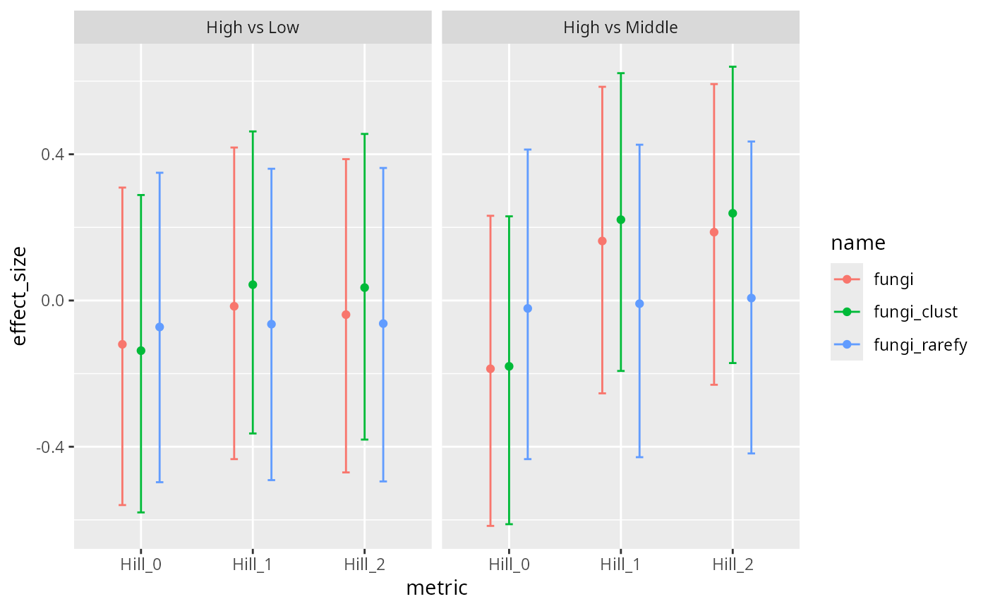 #> 14 fungi_rarefy Hill_0 High vs Mi… -0.0217 -0.434 0.413 0.877