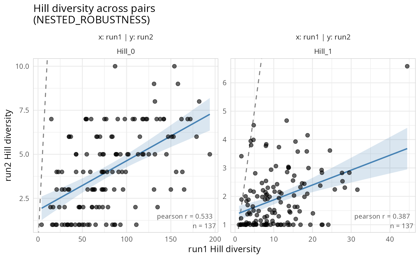 Each point represents one sample. A 1:1 reference line and optional regression line help assess how similar (or different) the diversity estimates are between two pipelines, runs, or primers.
