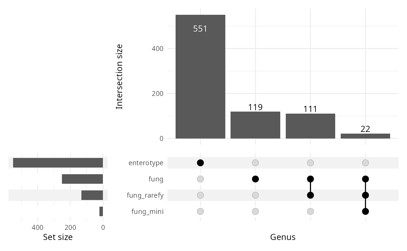 This function extracts the unique values for the specified taxonomic rank from each phyloseq object and creates a visualization showing the intersections between them. UpSet plots are generally better for visualizing complex intersections with more than 4 sets, while Venn diagrams work well for 2-4 sets.