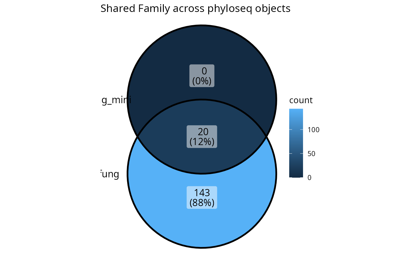 (character, default "auto") Type of plot to generate. One of "auto", "upset", or "venn". If "auto", uses Venn diagram for 4 or fewer phyloseq objects, UpSet plot otherwise.